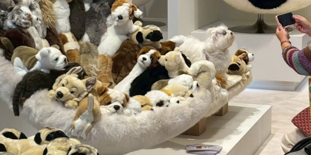 クリーンな展示空間にとても可愛らしいぬいぐるみが敷き詰められたチェアを展示していたブース。