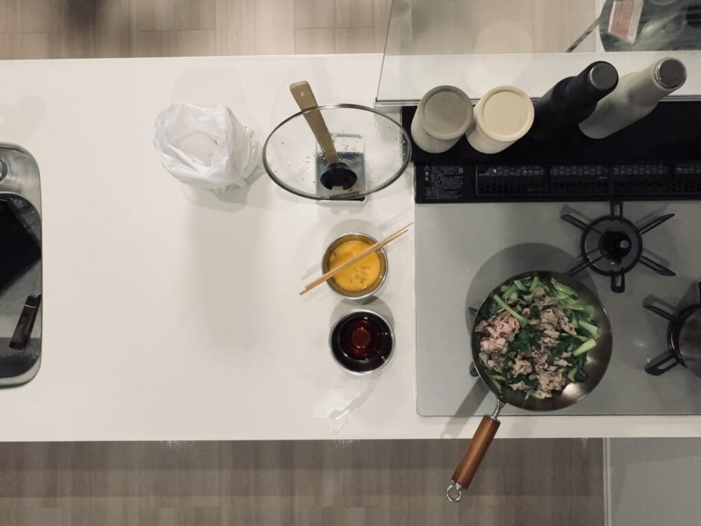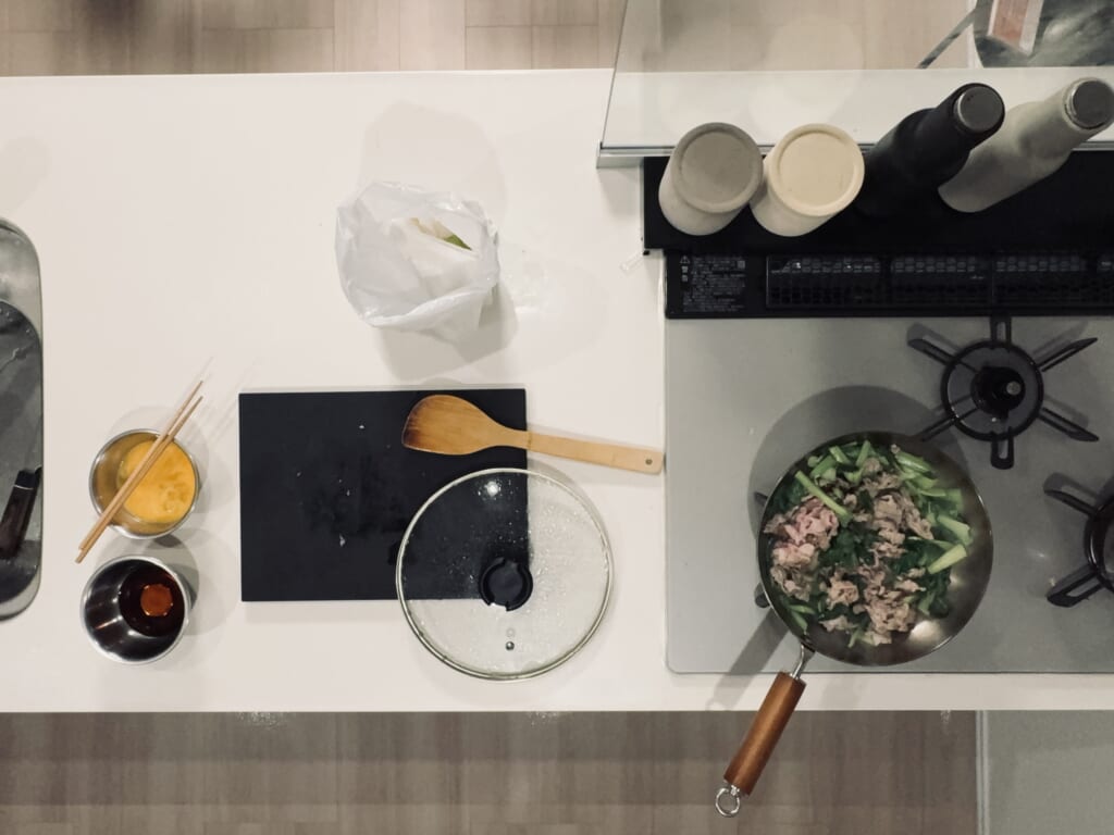まな板、包丁、ボウル、木ベラ、フライパンを洗って、