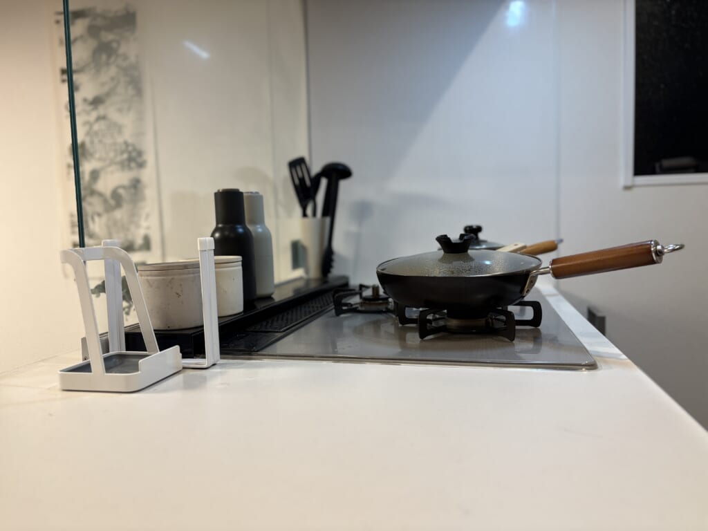 木ベラも蓋も「お玉&鍋ふたスタンド」にチョイ置き出来るから、