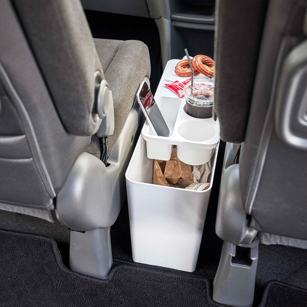 スリムな形状で、運転席や後部座席の間にもぴったりフィット。ファミリーカーに丁度いいサイズです。蓋はスライド式で、後ろの席からでもごみを捨てやすい設計。ドリンクホルダーやスマートフォンの収納スペースも備え、長距離ドライブでも快適に使えます。