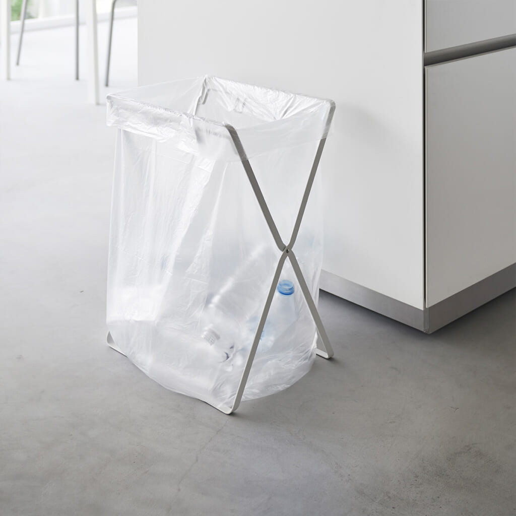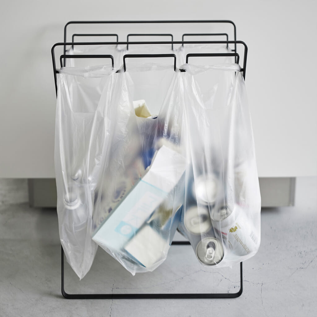 レジ袋を3つ掛けてもよし、45Lのゴミ袋を掛けて大きめサイズのゴミ袋スタンドとして使ってもよし。使わないときは畳んで隙間に収納でき、場所を取りません。