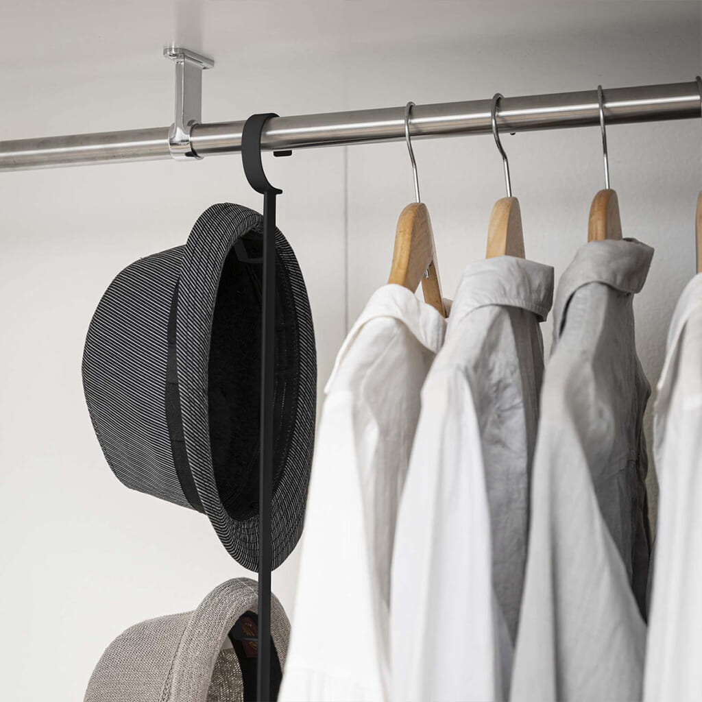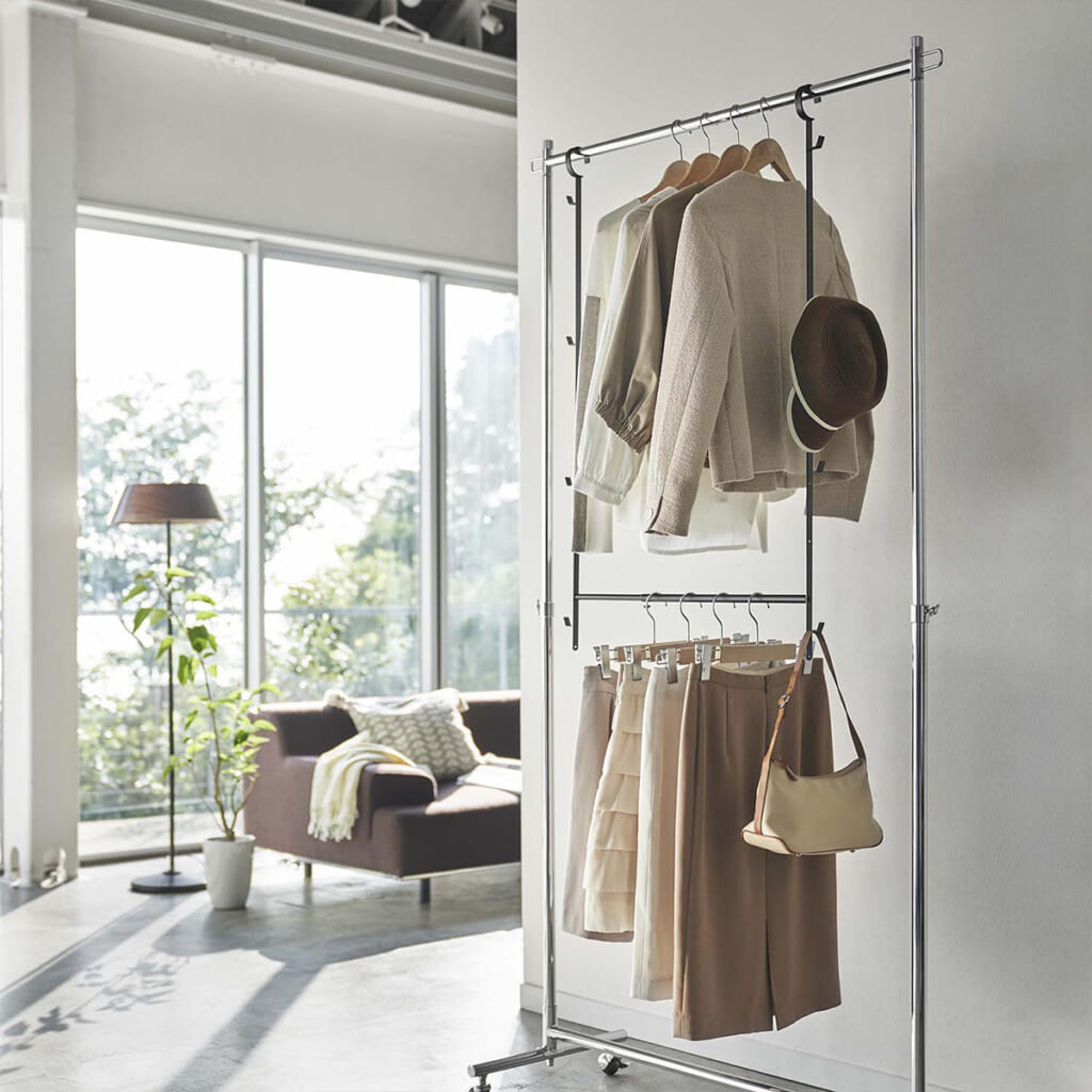 ハンガーバーなどに掛けるだけで上下2段に収納量がアップ!横幅は約50~90cm(内寸)に伸縮でき、高さも10cmごとに5段階で調節できます。再度のフックは帽子やカバンも掛けられます。