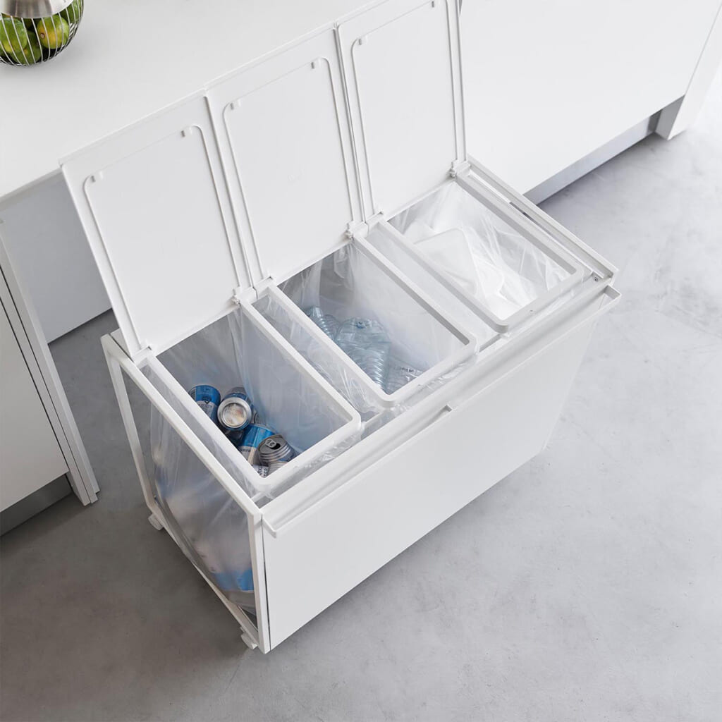 瓶・缶・ペットボトル・プラスチックなどのゴミを3分別できるダストワゴンです。ハンドルとキャスター付きで移動もスムーズ。インテリアになじむスタイリッシュなデザインです。