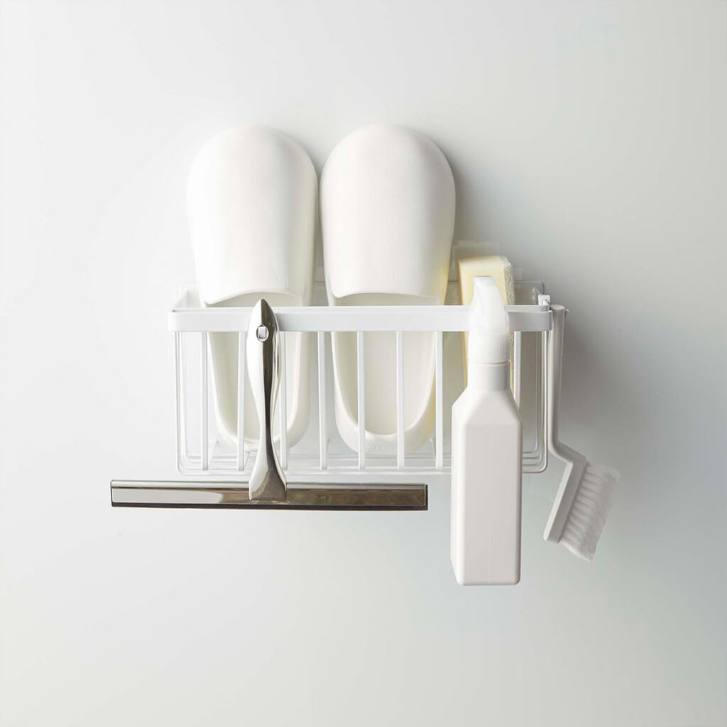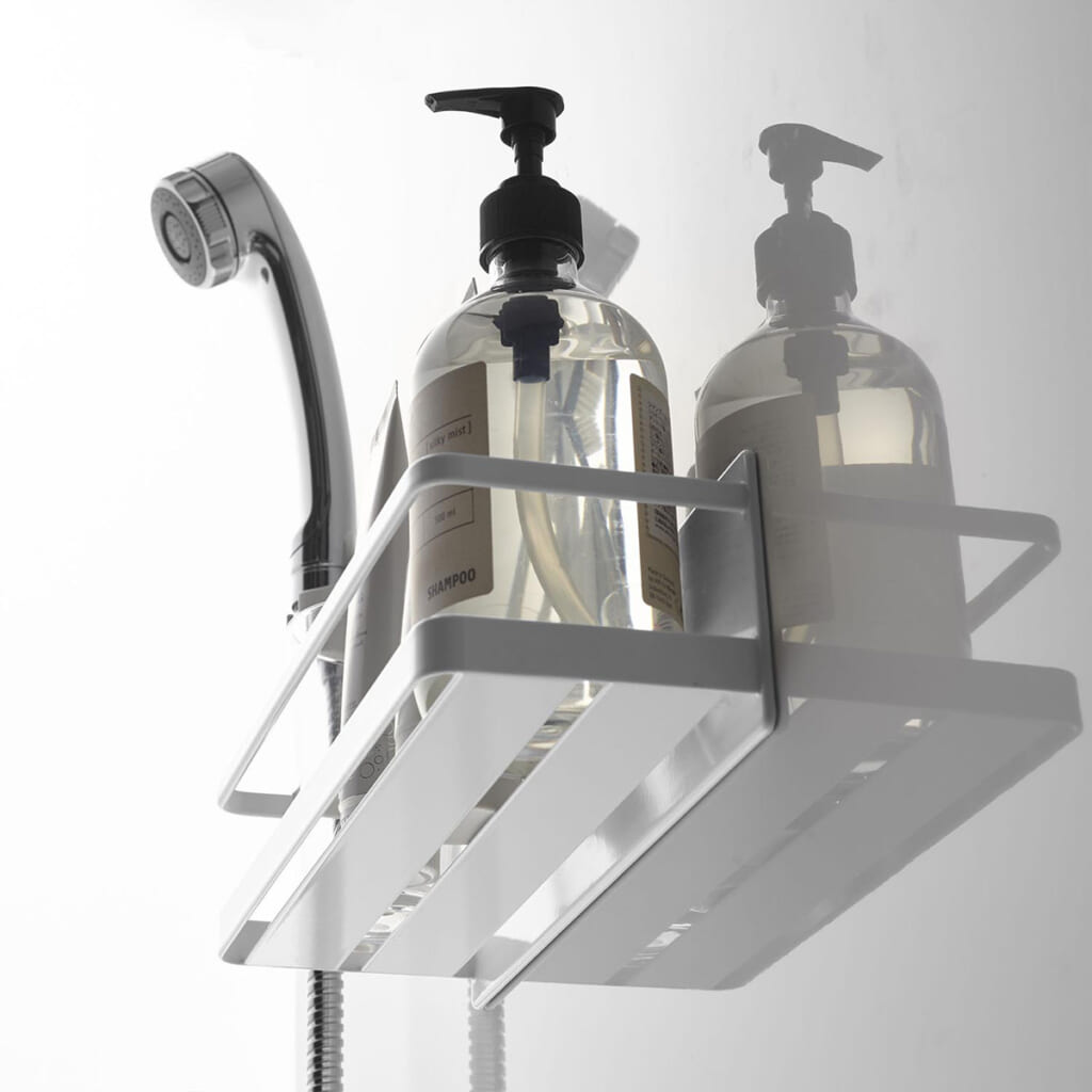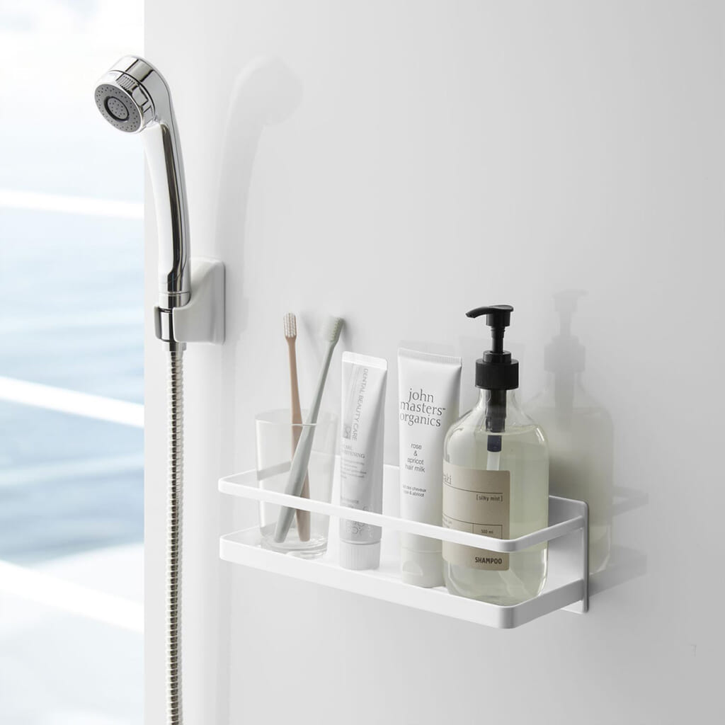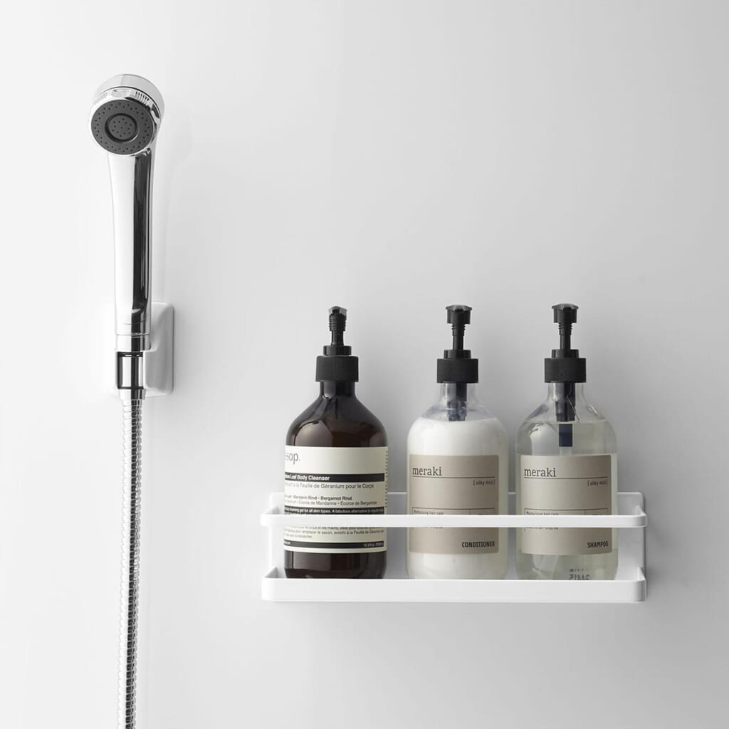 石鹸・歯ブラシ・タンブラーなどの収納やディスペンサーボトルの追加棚としてもおすすめのワイドラック。強力でありながら、壁面を傷付けにくいラバータイプのマグネットがしっかり支えます。