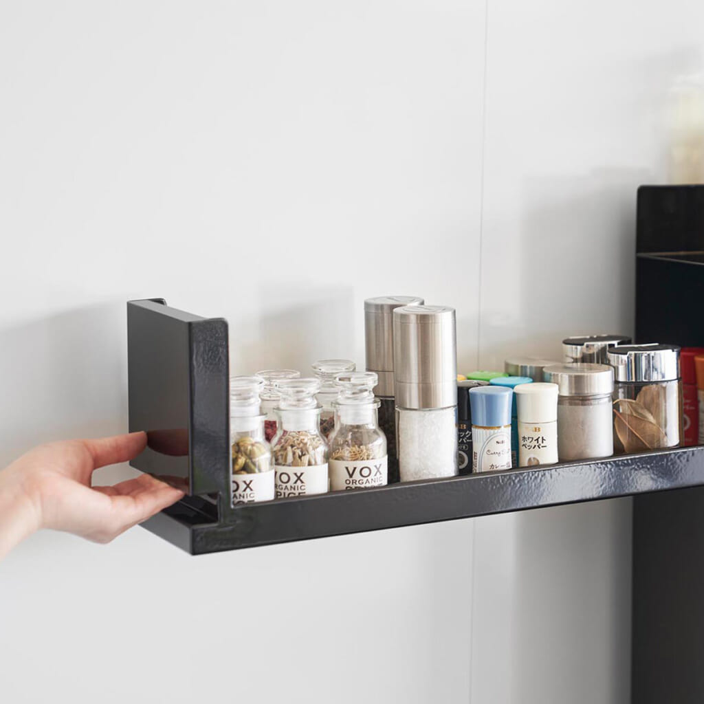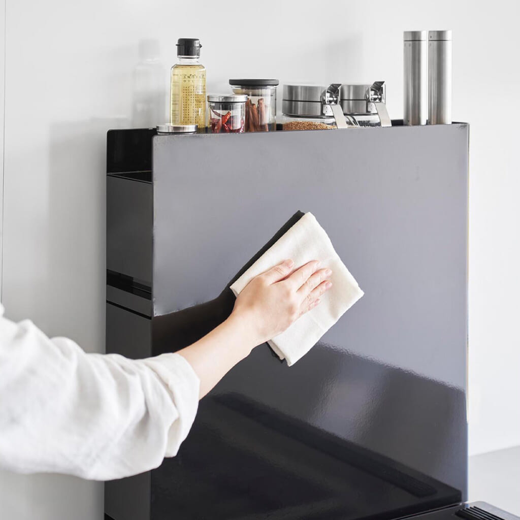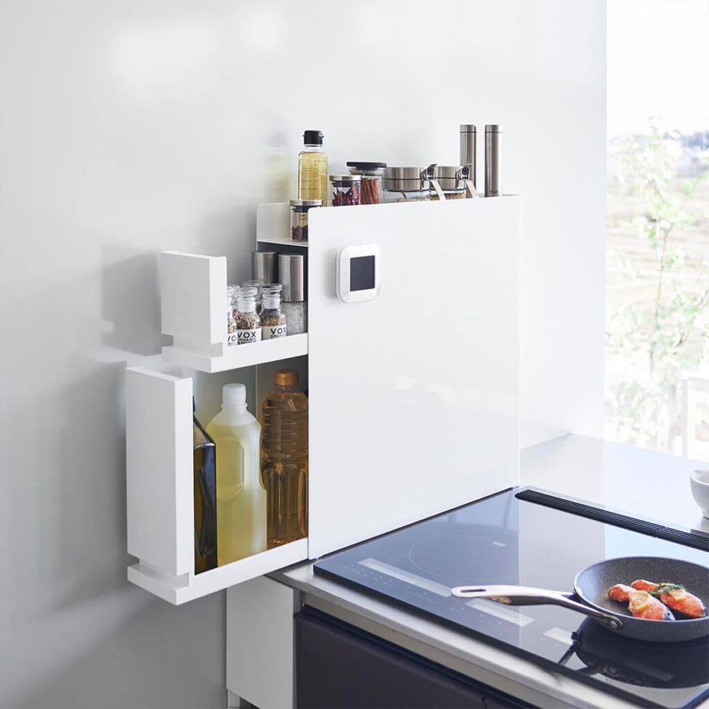 よく使うコンロの横に調味料を隠して収納できる大容量の2段ラック。上段にはスパイスなどの小さい調味料、下段には醤油や油などのボトルがたっぷり入ります。光沢のある本体でお手入れもラクラク♪