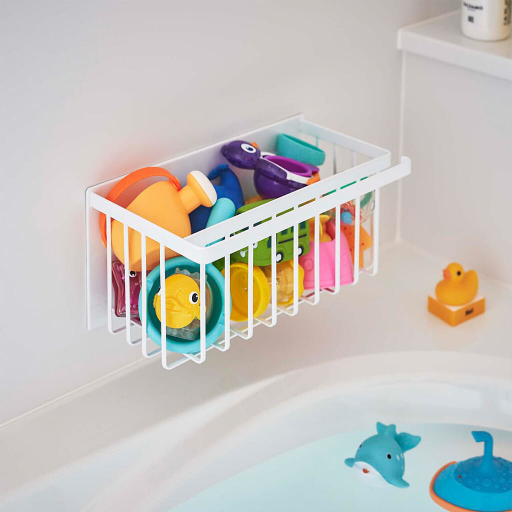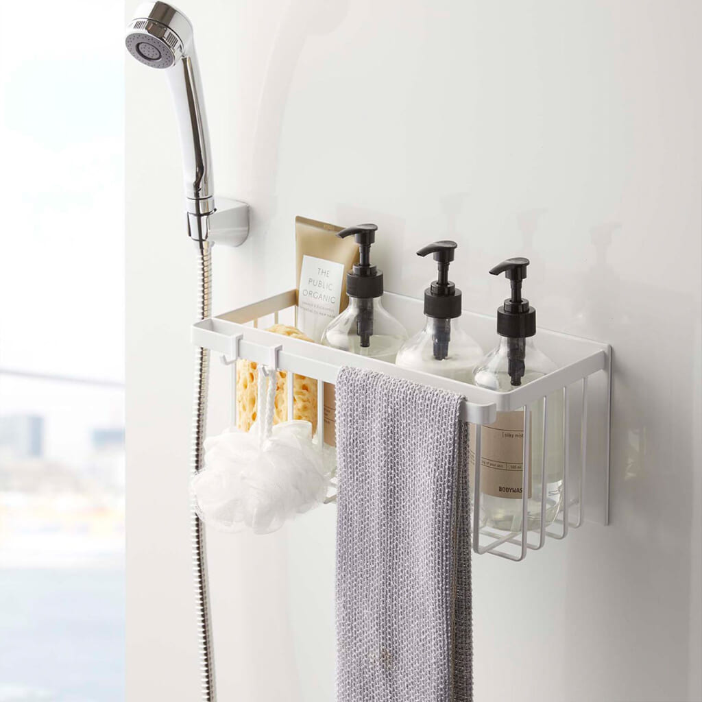 バスグッズをはじめ、 おもちゃやお掃除用品の収納など幅広く使える収納バスルームバスケット。手前のバーにはタオルなどを横から掛けることができます。小物を掛けられる着脱式フックも。
