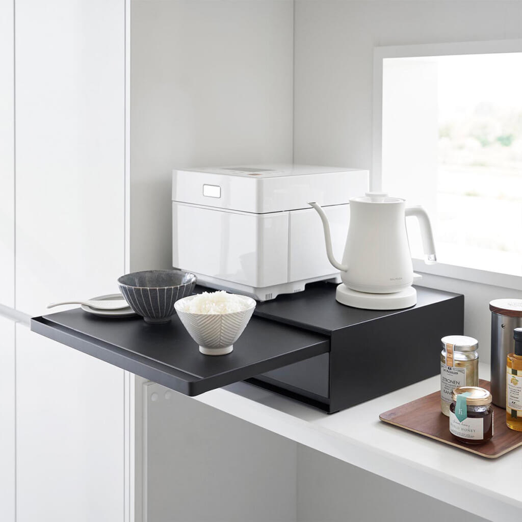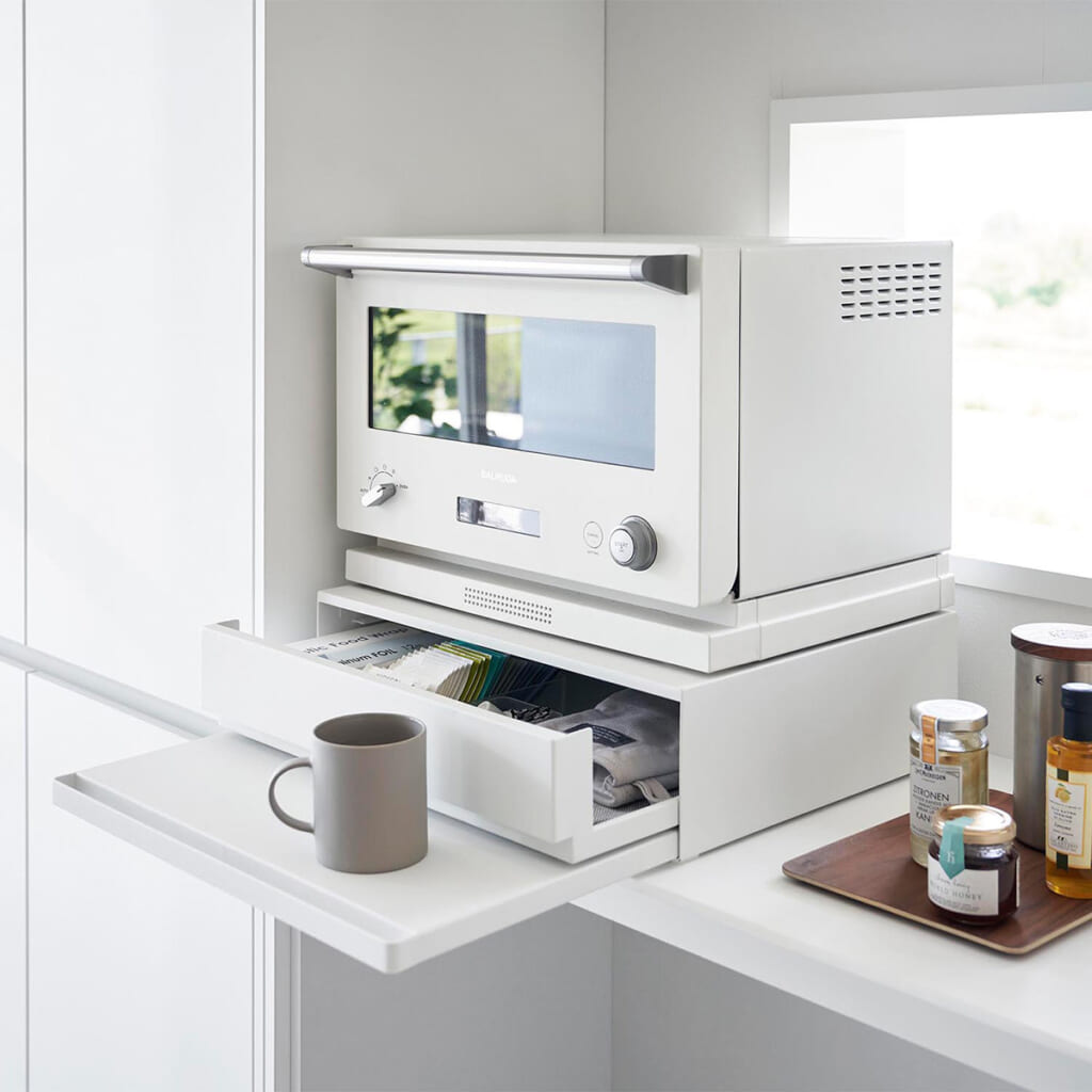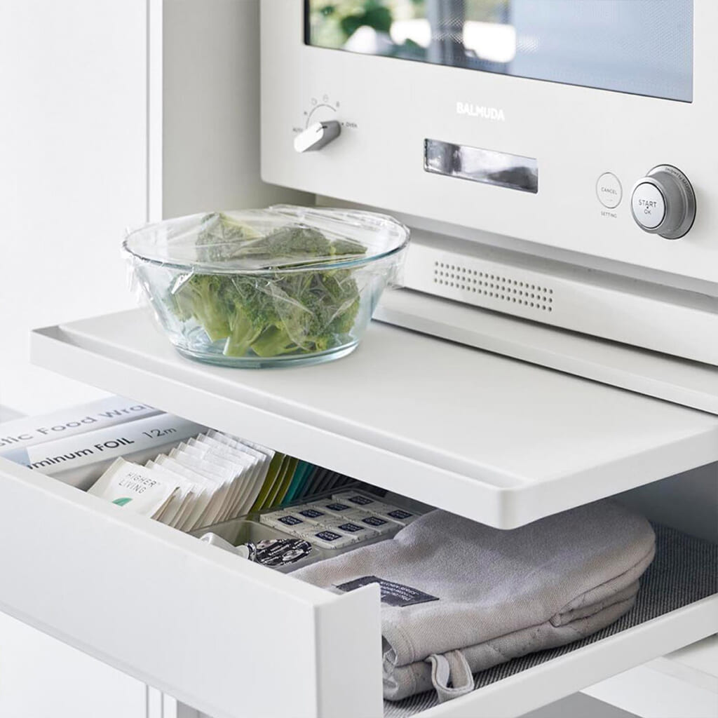キッチン家電の下にスライド式の作業台と収納スペースを両方確保できる収納ラック。スライドテーブルは調理スペースや料理の一時置きに、引き出しはキッチン小物の収納に役立ちます。