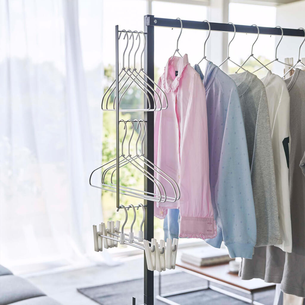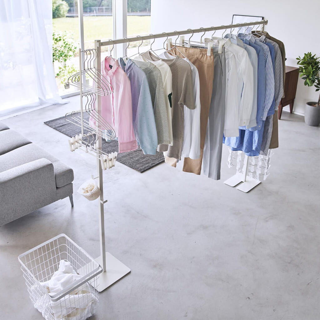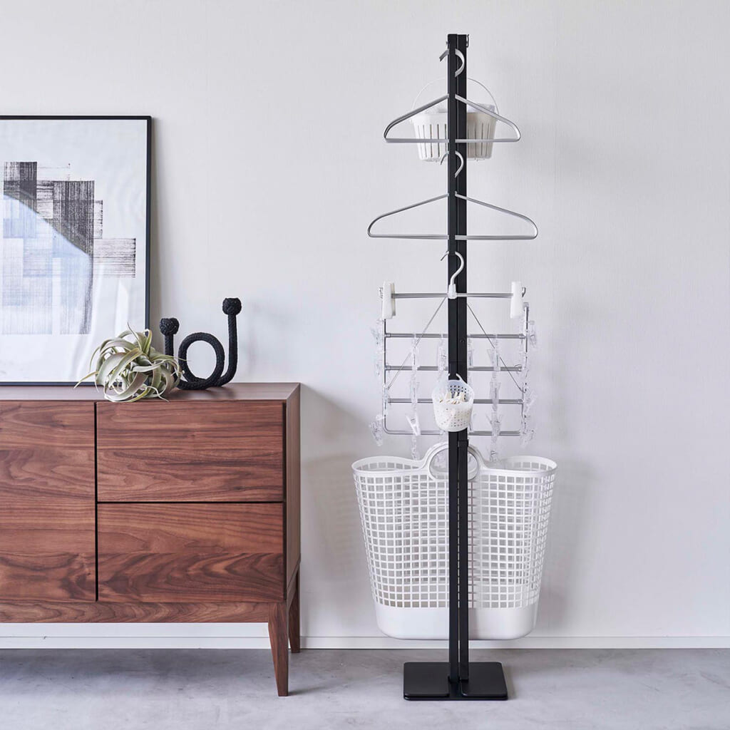 使う時はサッと広げて、使わないときは折り畳んでコンパクトに収納できる室内干し。支柱には様々な用途で使用できるフックが付いていて、洗濯かごやハンガーなども掛けられます。