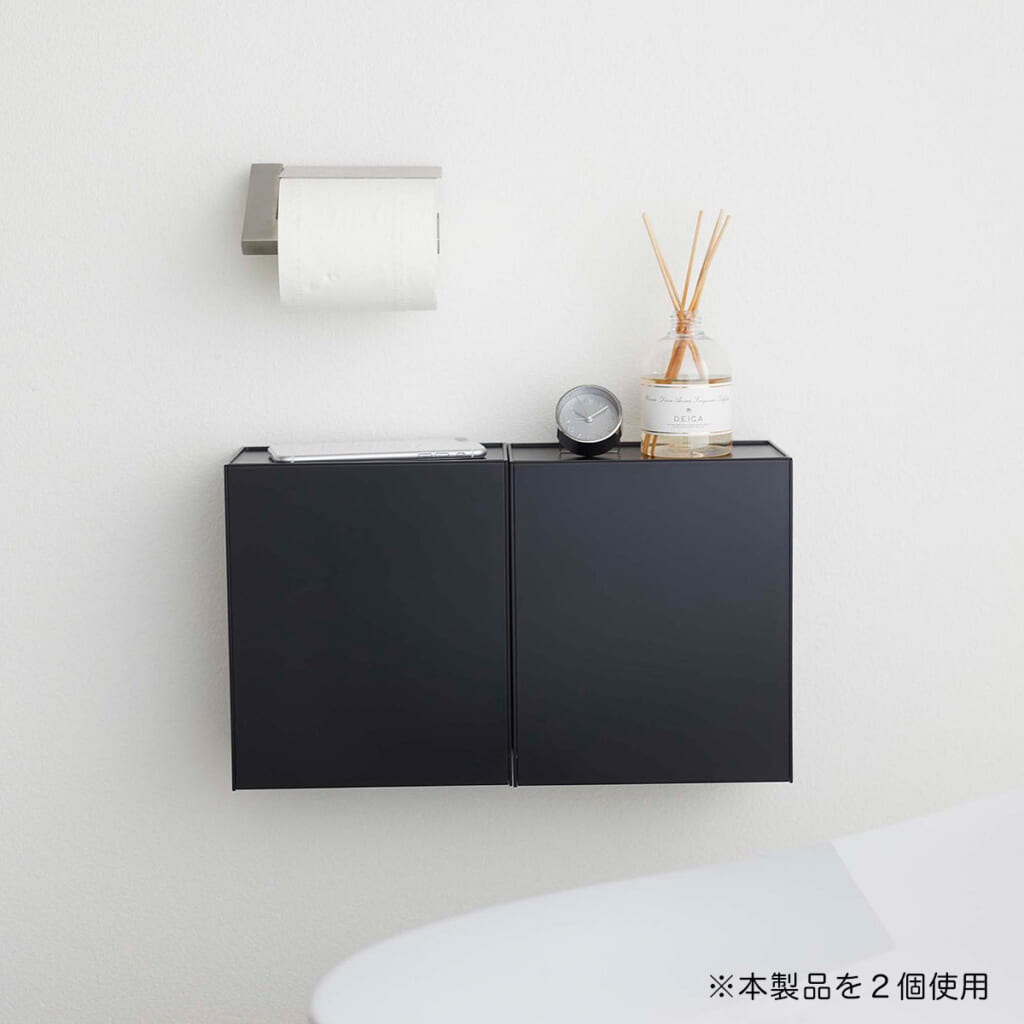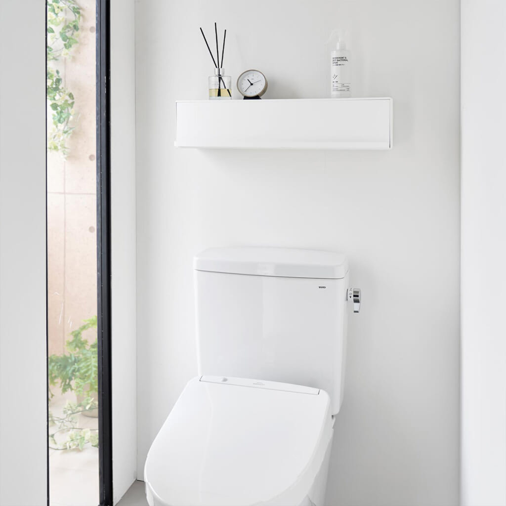 石こうボードピンでお好みの位置に取り付け可能な収納棚。幅60cmのワイドサイズで、トイレットペーパーやサニタリーなどのストックをスッキリ隠して大容量収納できます。扉は開閉がスムーズなフラップ式で、天板は小物置きとしても活用できます。