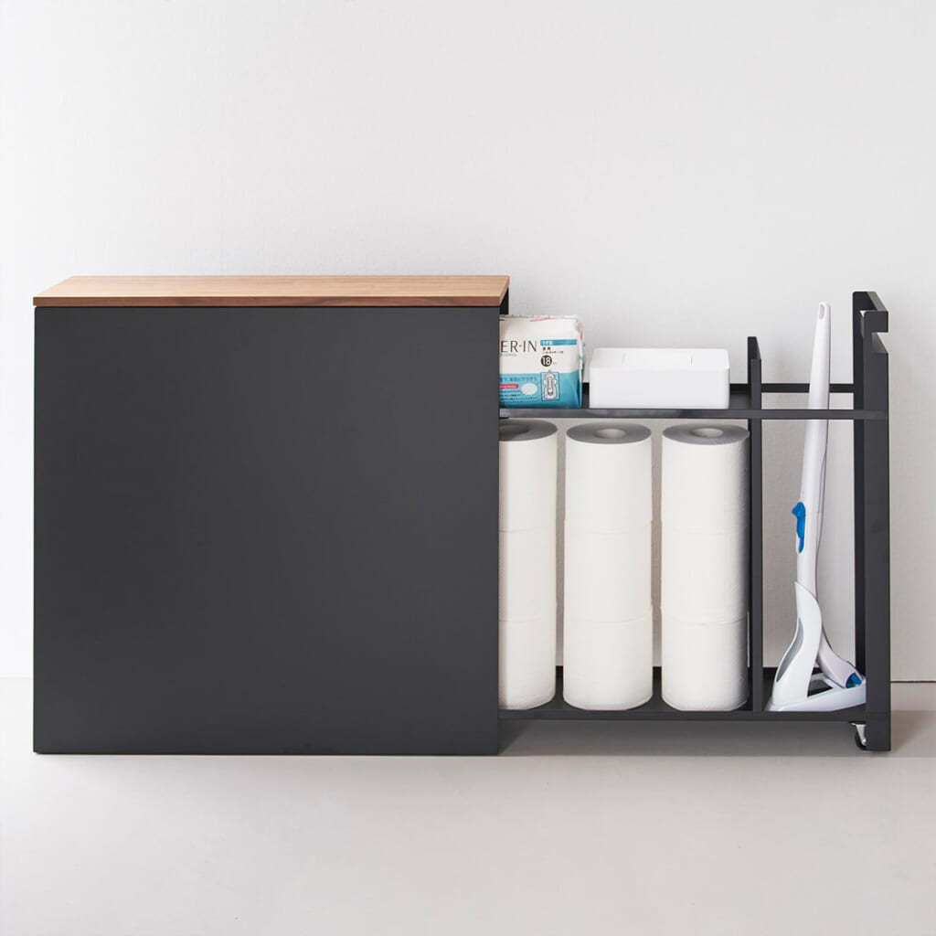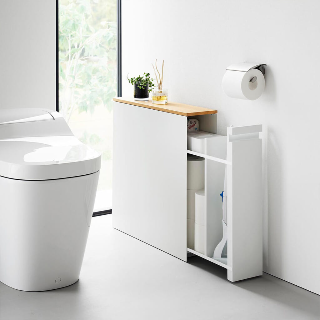 トイレットペーパーや掃除用品は、まとめて隠すことで印象が一変。中身が見えない収納なら、ごちゃつきやすいトイレも落ち着いた空間に。