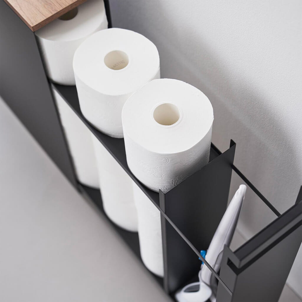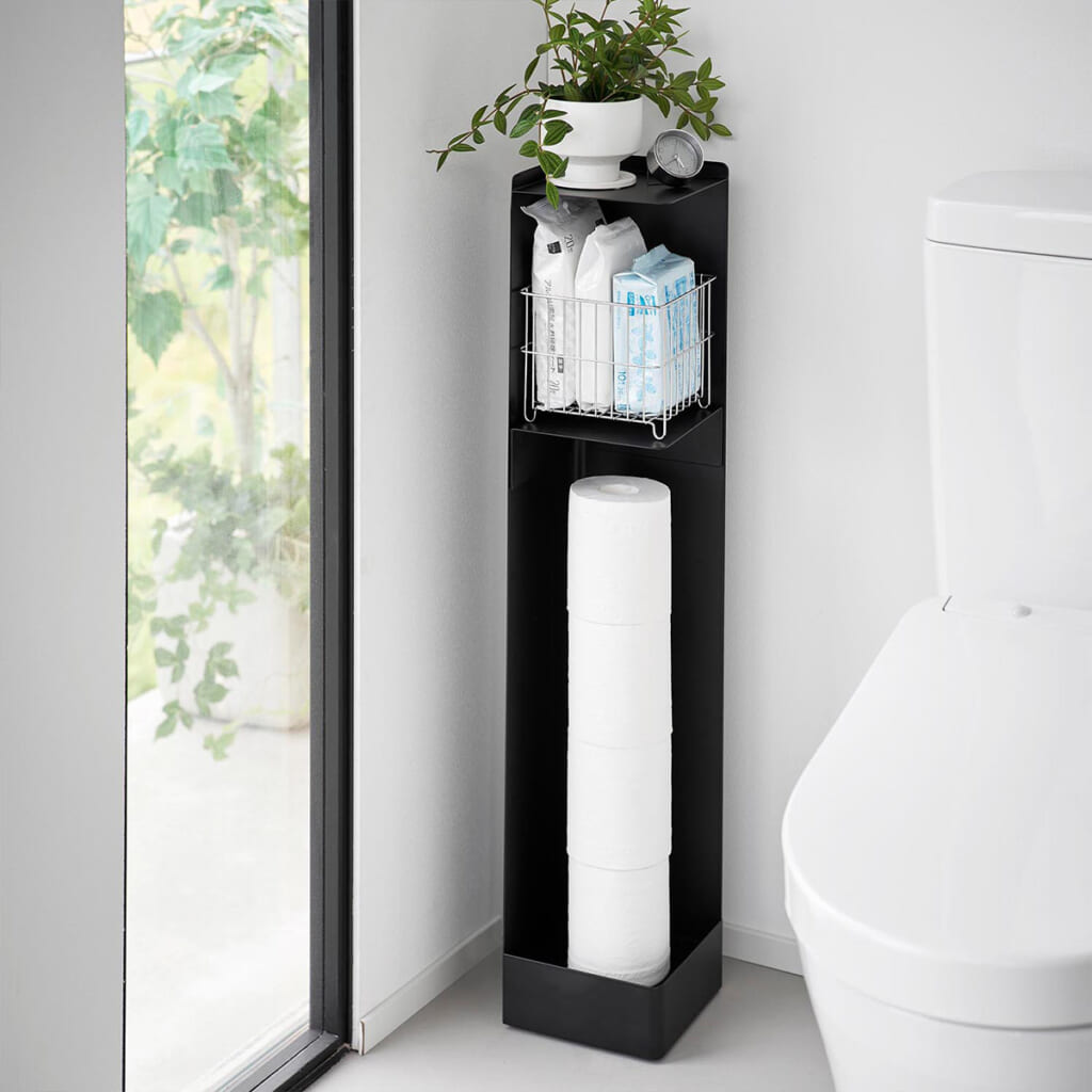 トイレットペーパー12ロールとトイレブラシが入る大容量の収納ラック。幅14cm高さ55cmのスリム設計なので、手洗いカウンターの下や狭いトイレにも設置可能です。サニタリー用品やウェットティッシュ、長いトイレブラシの収納にも。