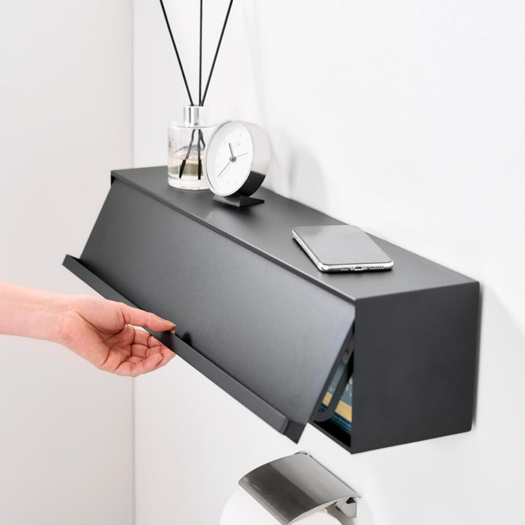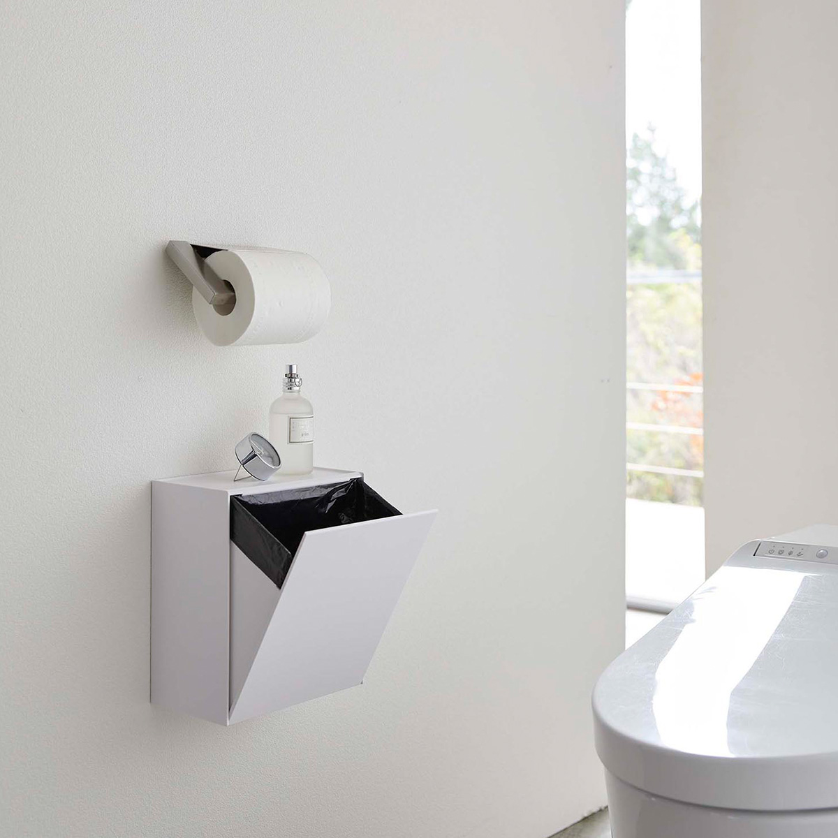 壁の穴が目立たない石こうボードピンで壁に取り付けられるトイレポット&収納ケース。フラップ式なので片手で簡単に開閉できます。板はトレーになっているので、スマートフォンなどの小物置きとしても便利。サニタリー用品などの小物の収納にも◎