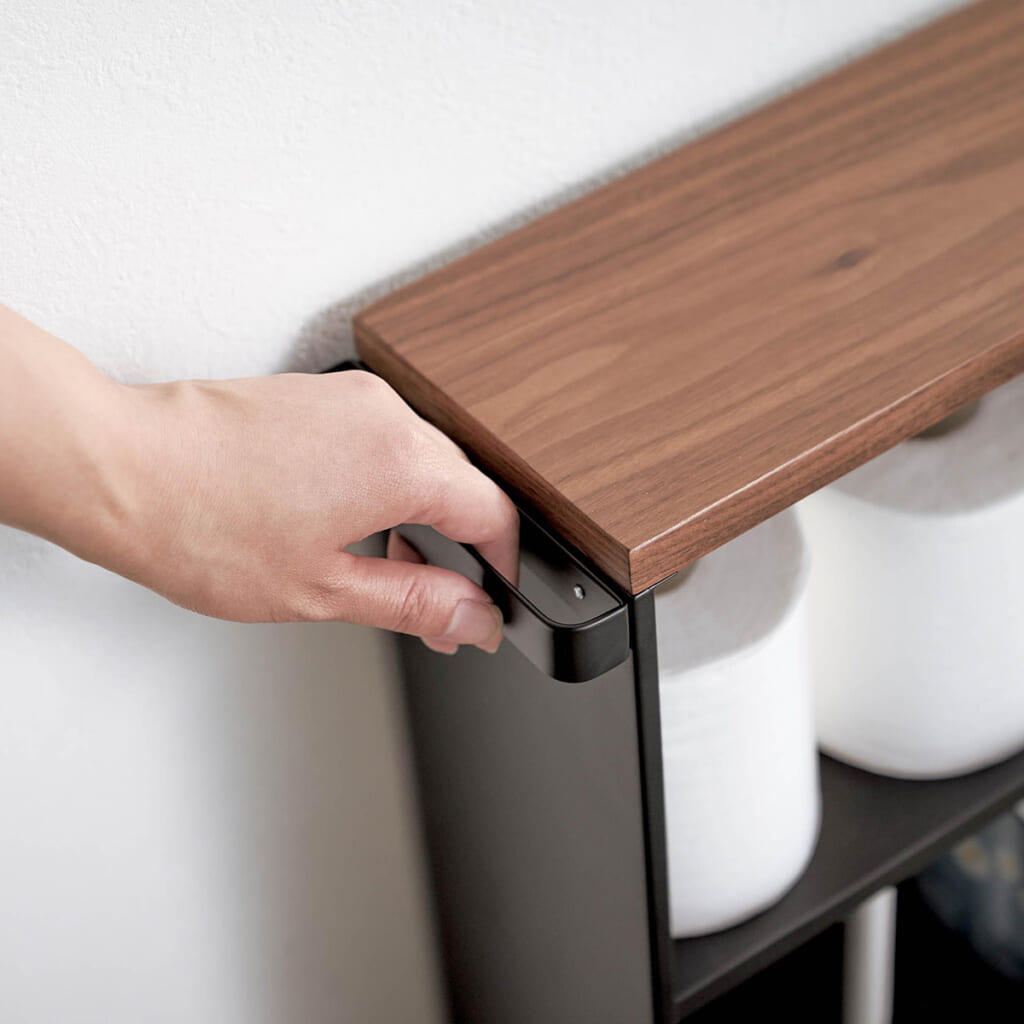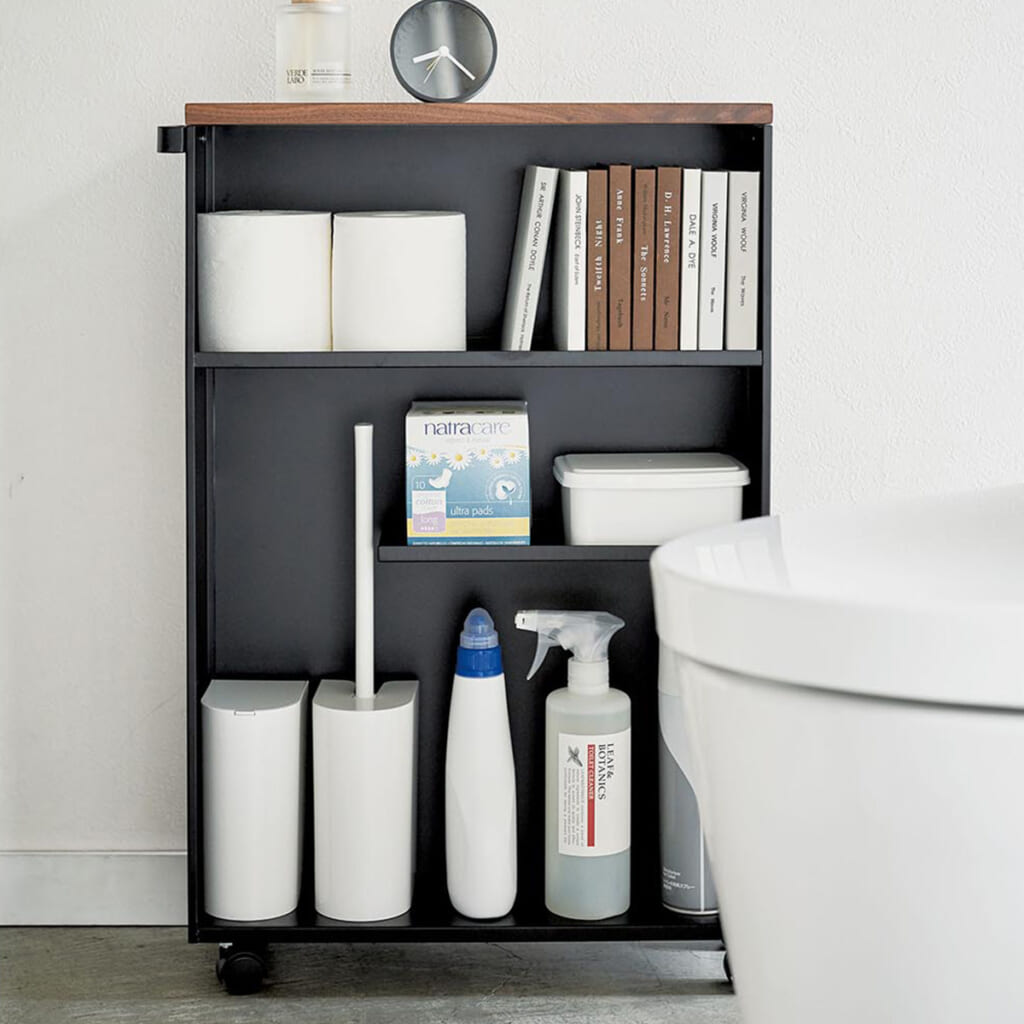 ハンドル付きのスリムなトイレ収納ワゴン!トイレットペーパーロールやトイレ用洗剤、除菌シートから文庫本などを一括収納できます。キャスター付きだから移動もラクラク!ワゴンを裏返せば、中を隠してスッキリした印象になります。