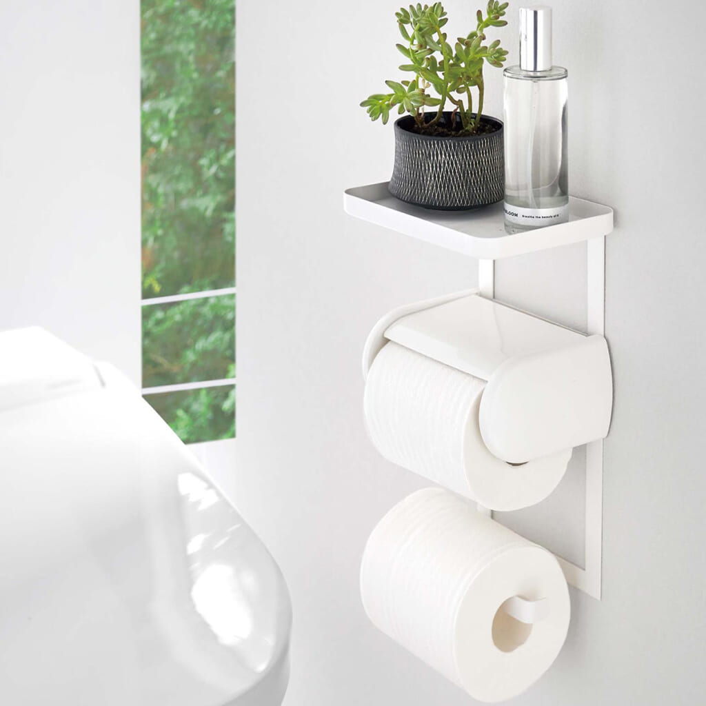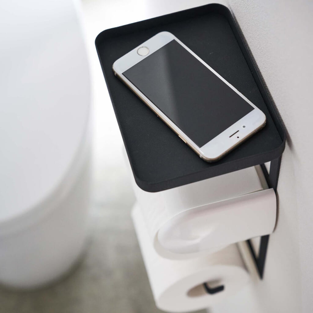 トイレットペーパーホルダーに差し込むだけの簡単取り付け!便利なトレー付きで掃除用具の収納や小物置き、スマートフォンの一時置きなどに使えます。下部ハンガーにはトイレットペーパーロールのストックを収納可能。