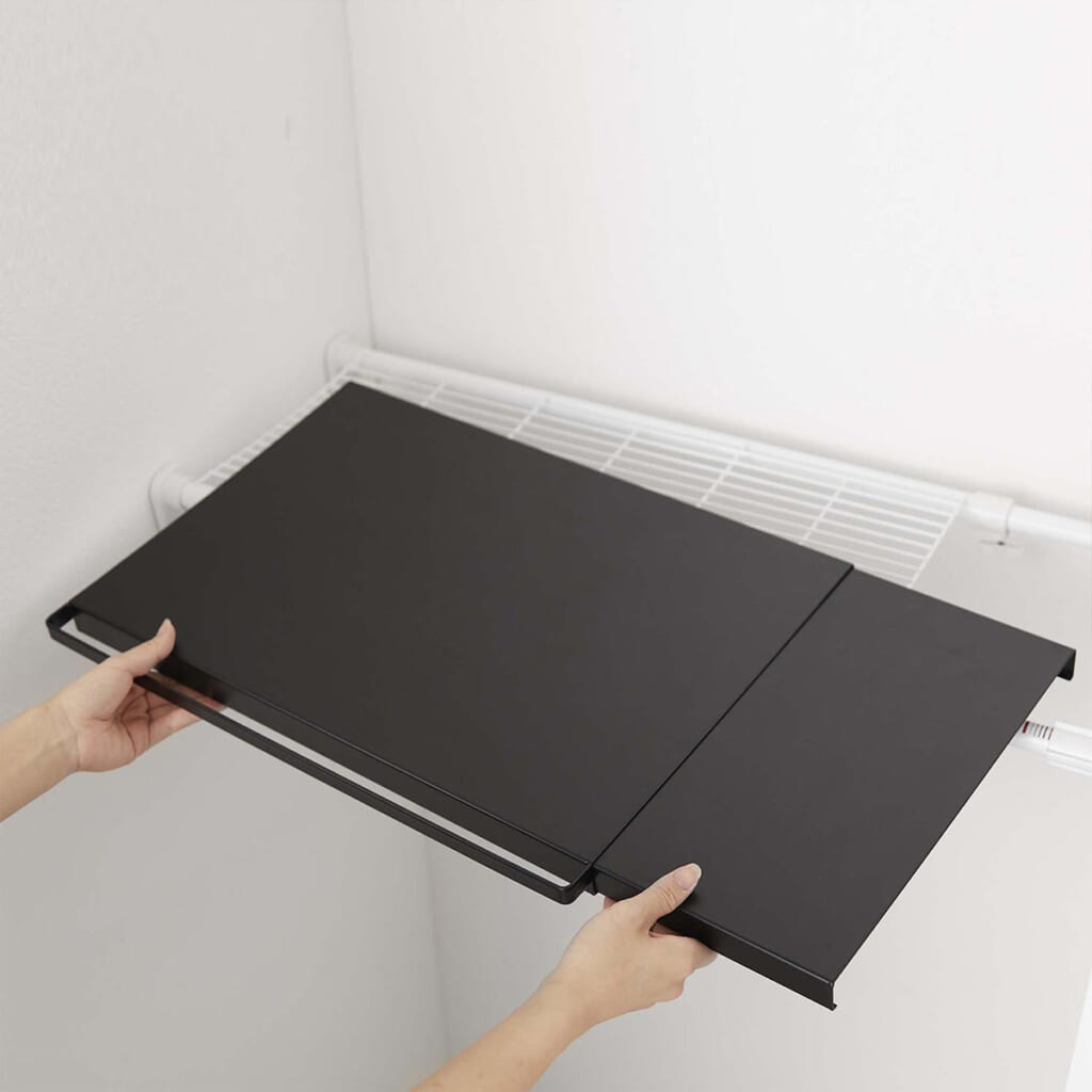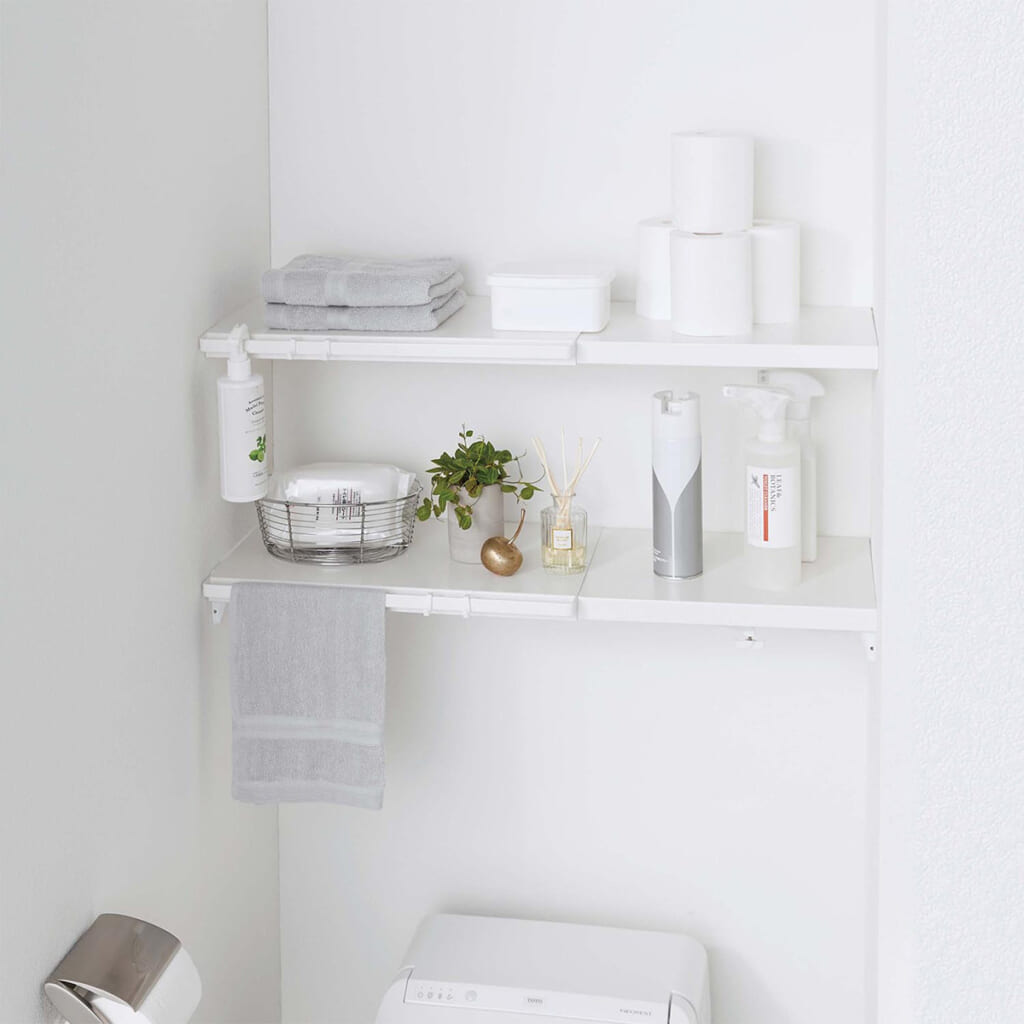 お手持ちのつっぱり棒やつっぱり棚にのせるだけで棚が完成!幅は約46.5~90cmの伸縮式です。フラットな棚になるので、細かい小物からボトルなどの不安定なものもしっかり置くことができます。ハンガーやタオルが収納できる便利なバー付きです。