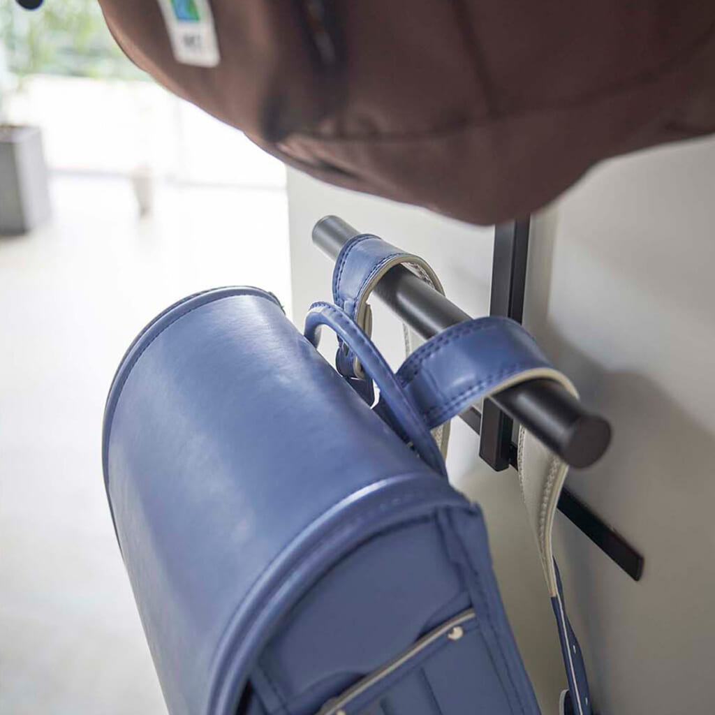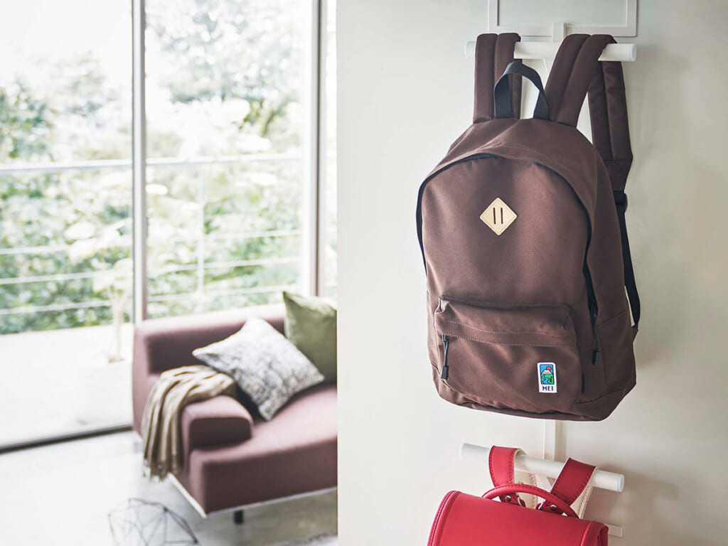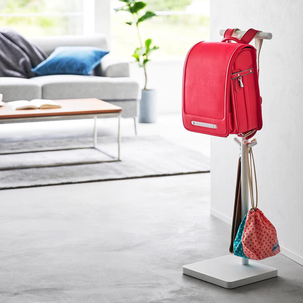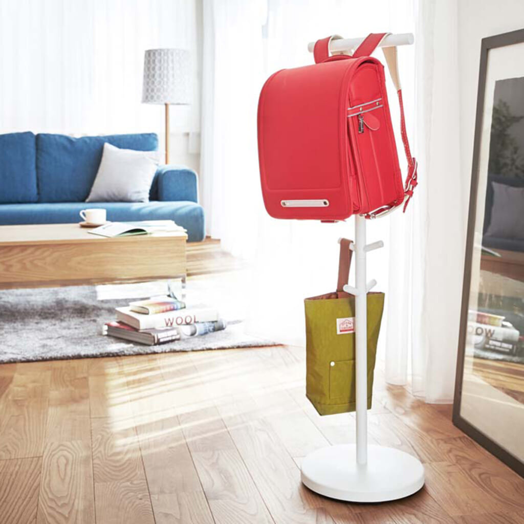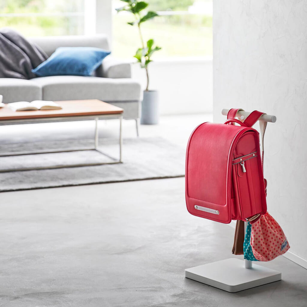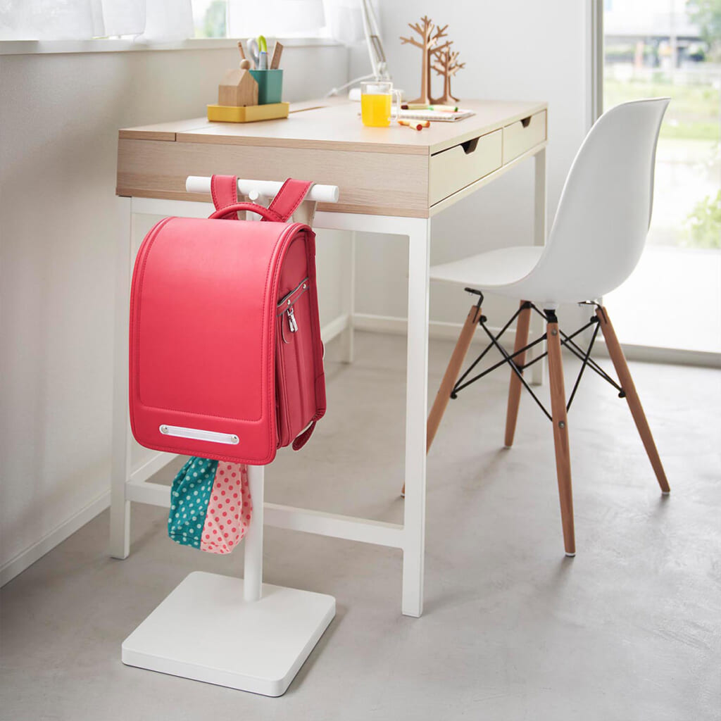 玄関、リビング、子供部屋など、どこでも置けるコンパクトサイズのスタンドです。掛けた状態でランドセルを開けたり、前後に2個掛けることも可能。飽きのこないシンプルなデザインで長く使っていただけます。