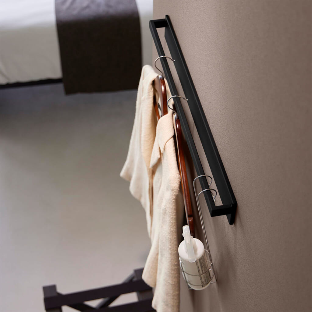 お手持ちの衣類ハンガーやS字フックを引っ掛けて使えるシンプルなハンガーバー。取り付け跡が目立ちにくい石こうボードピンで取り付けできます。