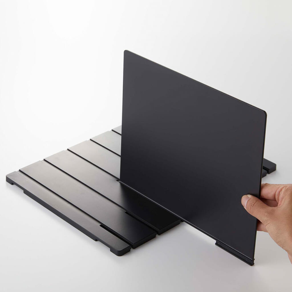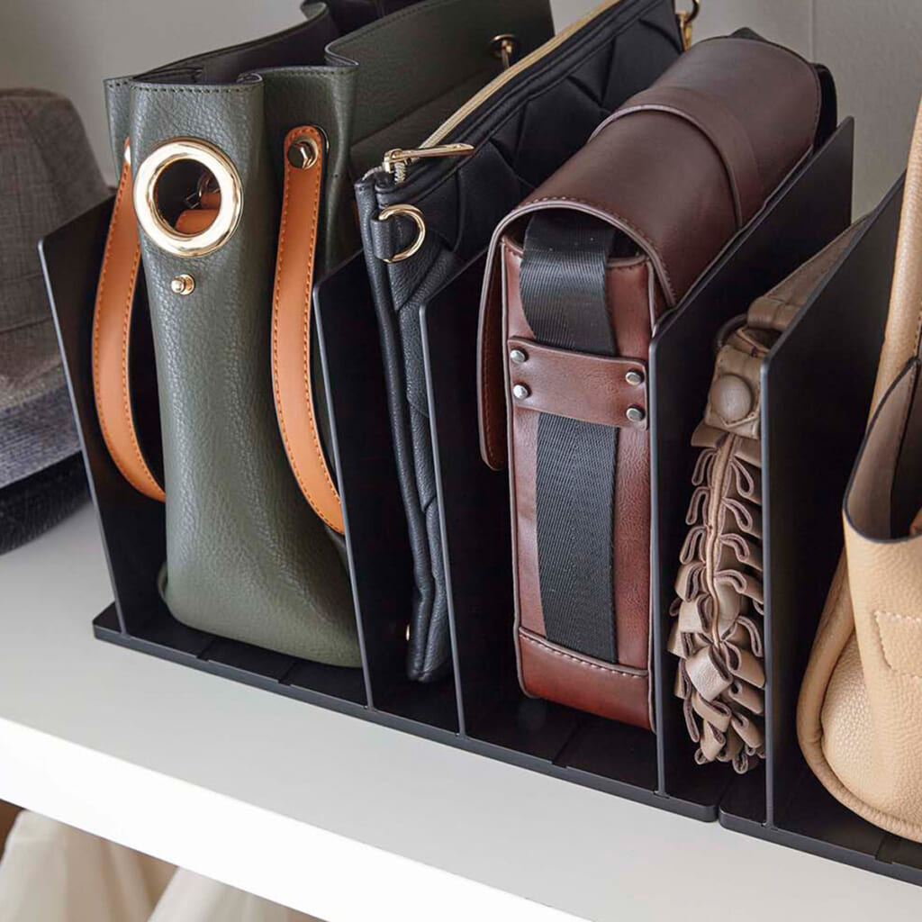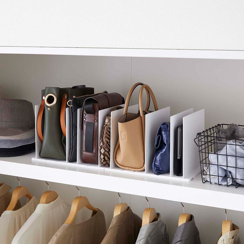 バッグのサイズに合わせて仕切り幅を調整できます。倒れやすい鞄も立てて収納できるから、場所を取らずスリムに収納できます。